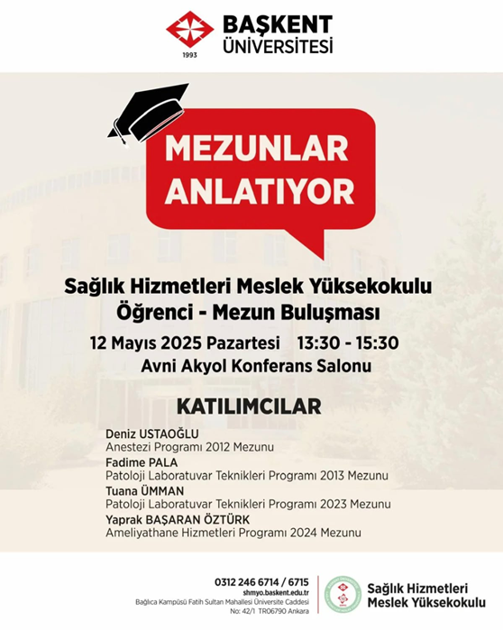 Sağlık Hizmetleri Meslek Yüksekokulu Öğrenci-Mezun Buluşması 12 Mayıs 2025 Pazartesi günü 13.30-15.30 saatleri arasında Avni Akyol Konferans Salonu'nda yapılacaktır.